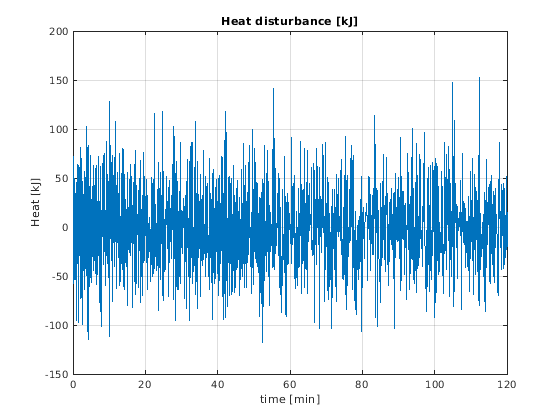 plot(HeatDist.time/60,HeatDist.signals.values/1000) title('Heat disturbance [kJ]'); ylabel('Heat [kJ]') xlabel('time [min]') grid on