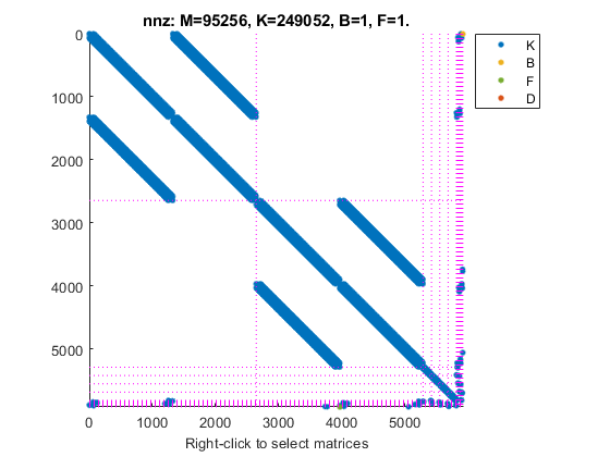 Можно использовать spy визуализировать разреженные матрицы в итоговой модели. Примите решение между матрицами быть отображенными с помощью меню отображения, к которому можно получить доступ путем щелчка правой кнопкой по графику.