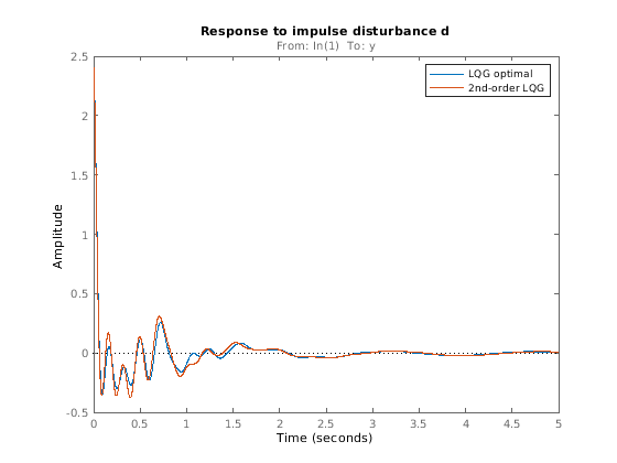 T0 = feedback(G,CLQG,+1); T1 = getIOTransfer(CL1,'d','y'); impulse(T0,T1,5) title('Response to impulse disturbance d') legend('LQG optimal','2nd-order LQG')