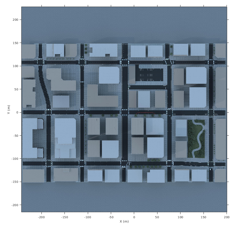 figure fileName = 'sim3d_USCityBlock.jpg'; I = imshow(fileName,spatialRef); set(gca,'YDir','normal') xlabel('X (m)') ylabel('Y (m)')