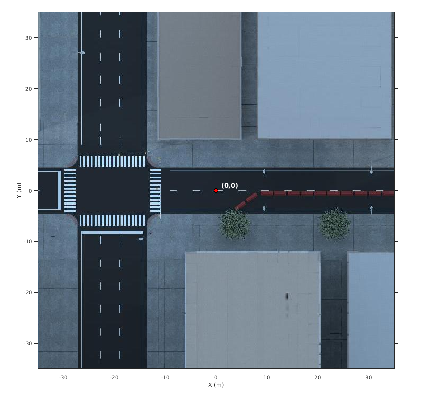 Можно использовать это изображение, чтобы смотреть сцену перед симуляцией и выбрать стартовые координаты для транспортных средств. Для получения дополнительной информации при использовании этих изображений, чтобы выбрать waypoints для приложений следования траектории, смотрите Выбрать пример Waypoints for Unreal Engine Simulation.