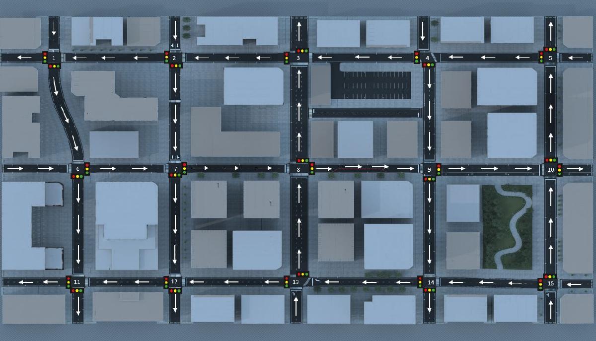 Каждое пересечение в сцене содержит две группы светофора. Этот светофор изменяет цвет на основе общих шаблонов светофора США. Все дороги в сцене являются односторонними и следуют за направлением трафика, показанного здесь.