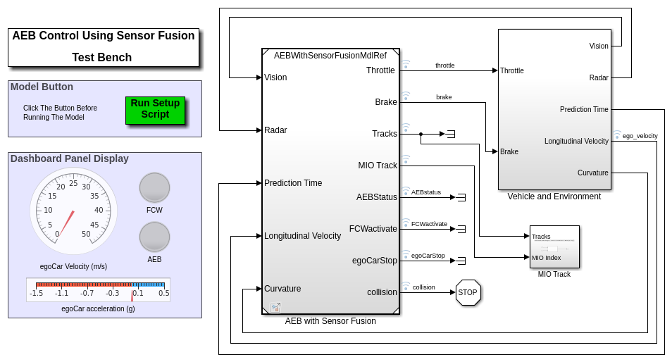 Модель реализует алгоритм AEB, описанный в Автономном Экстренном торможении с примером Fusion Датчика. Откройте модель.