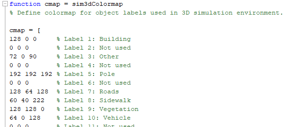Блок MATLAB function использует функционируйте, чтобы преобразовать метки в матрицу триплетов RGB для визуализации. Палитра основана на цветах, используемых в наборе данных CamVid, как показано в Семантической Сегментации в качестве примера Используя Глубокое обучение (Computer Vision Toolbox). Цвета сопоставлены с предопределенной меткой IDs, используемой в 3D сценах симуляции по умолчанию. Функция помощника label2rgb (Image Processing Toolbox)sim3dColormap задает палитру. Смотрите эти значения палитры.