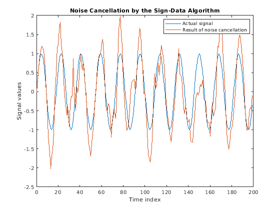 lms = dsp.LMSFilter(12,'Method','Sign-Sign LMS',... 'StepSize',mu,'InitialConditions',coeffs); [~,e] = lms(noise,d); L = 200; plot(0:199,signal(1:200),0:199,e(1:200)); title('Noise cancellation performance by the sign-sign LMS algorithm'); legend('Actual signal','Error after noise reduction',... 'Location','NorthEast') xlabel('Time index') ylabel('Signal value')