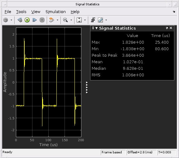У вас должны быть Simscape™ или лицензия DSP System Toolbox, чтобы использовать Пиковое Средство поиска, Двухуровневые Измерения и Статистику Сигнала.