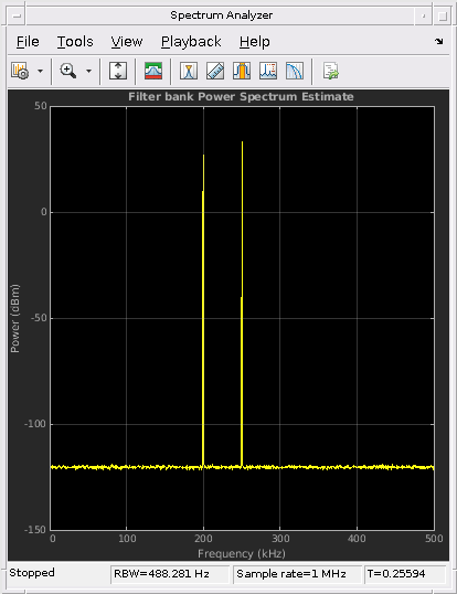 Обе валлийских и основанных на наборе фильтров оценки спектра обнаружили два тона на уровне 200 кГц и 250 кГц. Основанная на наборе фильтров оценка спектра имеет лучшую изоляцию тонов. Для той же Пропускной способности Разрешения (RBW) усредненная измененная периодограмма метод (валлийцев) требует, чтобы 3 073 выборки вычислили спектр по сравнению с 2 048 требуемыми основанной на наборе фильтров оценкой. Обратите внимание на то, что односторонний уровень шума-120 dBm точно показывают в наборе фильтров спектральную оценку.
