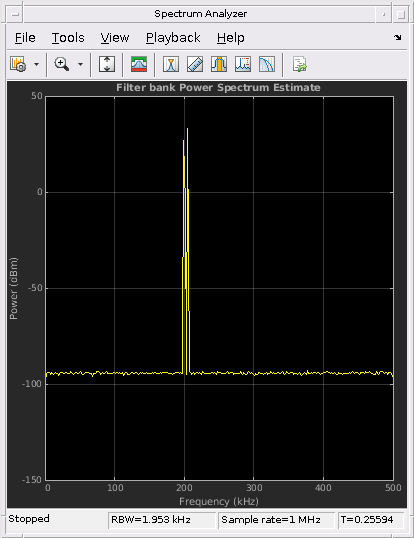 NAvg = 100; Fs = 1e6; FrameSize = 64; NumFreqBins = 512; filterBankRBW = Fs/NumFreqBins;