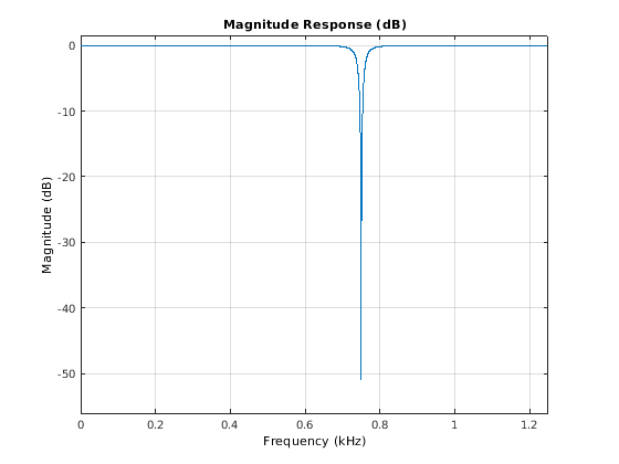Wo = 750; Q = 35; BW = Wo/Q; NotchFilter = dsp.NotchPeakFilter('Bandwidth',BW,... 'CenterFrequency',Wo, 'SampleRate',Fs); fvtool(NotchFilter);