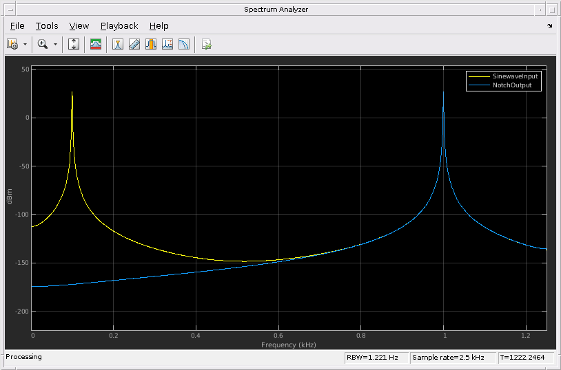 Fs = 2500; Sineobject1 = dsp.SineWave('SamplesPerFrame',1024,... 'SampleRate',Fs,'Frequency',100); Sineobject2 = dsp.SineWave('SamplesPerFrame',1024,... 'SampleRate',Fs,'Frequency',1000); SA = dsp.SpectrumAnalyzer('SampleRate',Fs,'NumInputPorts',2,... 'PlotAsTwoSidedSpectrum',false,... 'ChannelNames',{'SinewaveInput','NotchOutput'},'ShowLegend',true);
