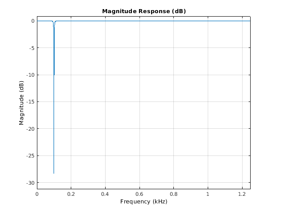 FreqVec = [100 500 750 1000]; VecIndex = 1; VecElem = FreqVec(VecIndex); for Iter = 1:3000 Sinewave1 = Sineobject1(); Sinewave2 = Sineobject2(); Input = Sinewave1 + Sinewave2; if (mod(Iter,350)==0) if VecIndex < 4 VecIndex = VecIndex+1; else VecIndex = 1; end VecElem = FreqVec(VecIndex); end NotchFilter.CenterFrequency = VecElem; NotchFilter.Bandwidth = NotchFilter.CenterFrequency/Q; Output = NotchFilter(Input); SA(Input,Output); end fvtool(NotchFilter)