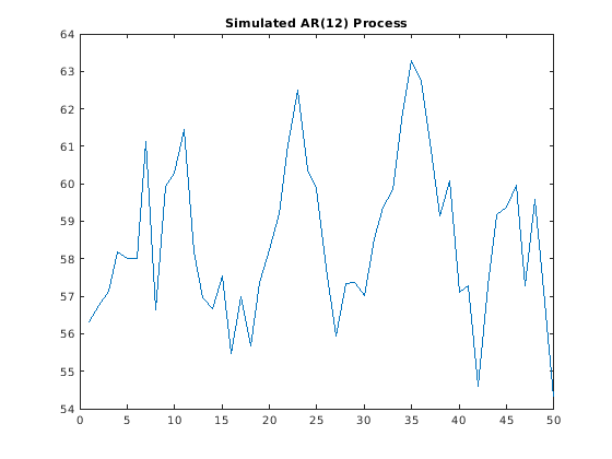 Mdl = arima('Constant',3,'AR',{0.7,0.25},'ARLags',[1,12],... 'Variance',2); rng('default') Y = simulate(Mdl,300); Y = Y(251:300); figure plot(Y) xlim([0,50]) title('Simulated AR(12) Process')