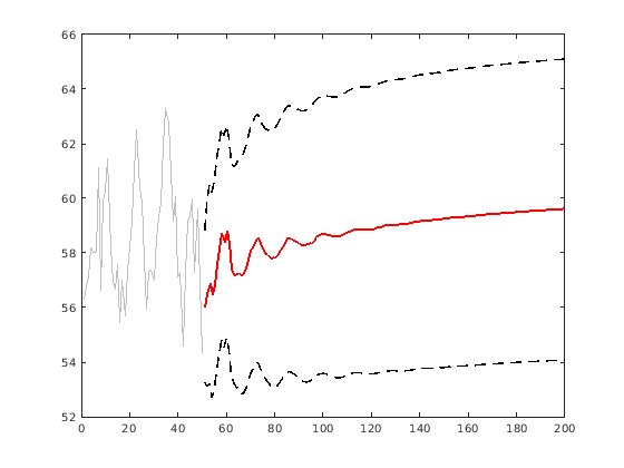 figure plot(Y,'Color',[.75,.75,.75]) hold on plot(51:200,Yf2,'r','LineWidth',2) plot(51:200,[upper2,lower2],'k--','LineWidth',1.5) xlim([0,200]) hold off