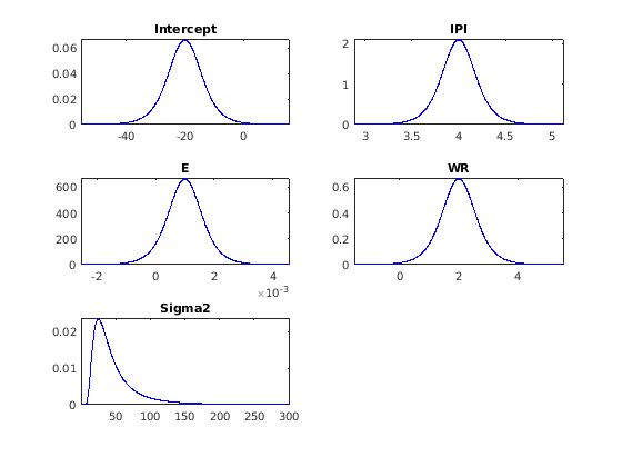 pointsUsedPrior массив ячеек 5 на 1 1 1000 числовых векторов, представляющих значения параметров что plot использование, чтобы построить соответствующую плотность. Первый элемент соответствует прерыванию, следующие три элемента соответствуют коэффициентам регрессии, и последний элемент соответствует отклонению воздействия. priorDensities1 имеет те же размерности как pointsUsed и содержит соответствующие значения плотности.