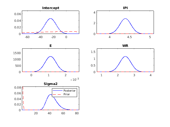 [pointsUsedPP,posteriorDensities2,priorDensities2] = plot(PosteriorMdl,PriorMdl);