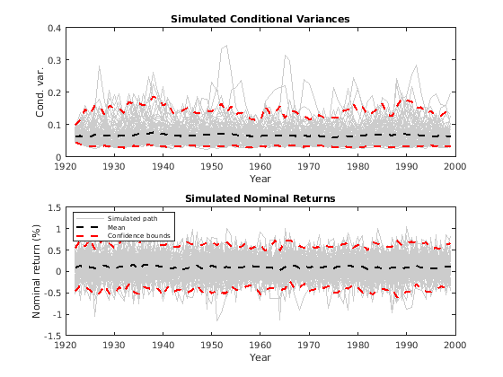 VSimBar = mean(VSim,2); VSimCI = quantile(VSim,[0.025 0.975],2); YSimBar = mean(YSim,2); YSimCI = quantile(YSim,[0.025 0.975],2); figure; subplot(2,1,1); h1 = plot(dates,VSim,'Color',0.8*ones(1,3)); hold on; h2 = plot(dates,VSimBar,'k--','LineWidth',2); h3 = plot(dates,VSimCI,'r--','LineWidth',2); hold off; title('Simulated Conditional Variances'); ylabel('Cond. var.'); xlabel('Year'); subplot(2,1,2); h1 = plot(dates,YSim,'Color',0.8*ones(1,3)); hold on; h2 = plot(dates,YSimBar,'k--','LineWidth',2); h3 = plot(dates,YSimCI,'r--','LineWidth',2); hold off; title('Simulated Nominal Returns'); ylabel('Nominal return (%)'); xlabel('Year'); legend([h1(1) h2 h3(1)],{'Simulated path' 'Mean' 'Confidence bounds'},... 'FontSize',7,'Location','NorthWest');