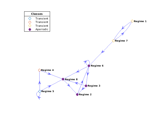 В этом примере показано, как к программно и визуально идентифицируют классы в Цепи Маркова. Пример также извлекает текущий класс из цепи для последующего анализа.