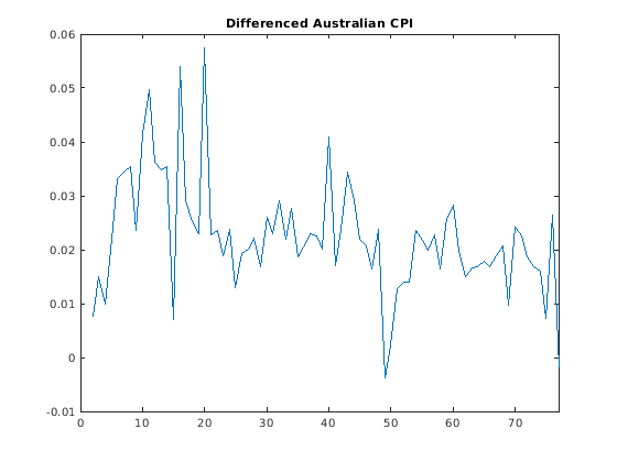 load Data_JAustralian y = DataTable.PAU; T = length(y); dY = diff(y); figure plot(2:T,dY) xlim([0,T]) title('Differenced Australian CPI')