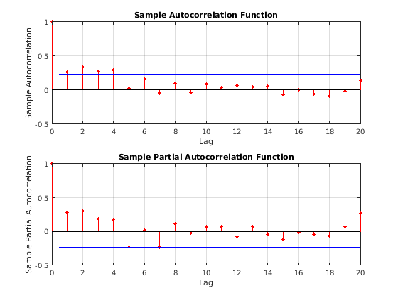 figure subplot(2,1,1) autocorr(dY) subplot(2,1,2) parcorr(dY)