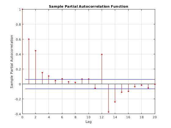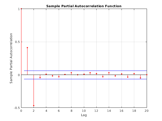 Количество задержек в демонстрационном PACF в виде разделенной запятой пары, состоящей из 'NumLags' и положительное целое число. parcorr использование изолирует 0:NumLags оценить PACF.