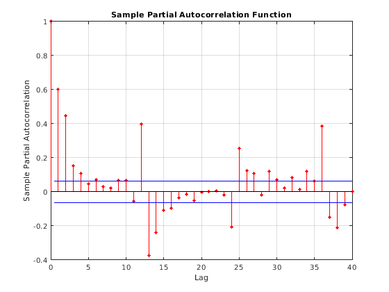 Элементы pacf соответствуйте задержкам 0,1,2..., NumLags (то есть, элементы lags). Навсегда серия y, задержка 0 частичных автокорреляций pacf(1)= 1 .