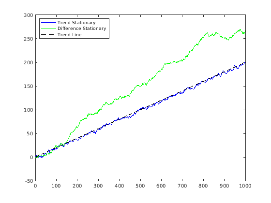 T = 1000; % Sample size t = (1:T)'; % Period vector rng(5); % For reproducibility randm = randn(T,2); % Innovations y = zeros(T,2); % Columns of y are data series % Build trend stationary series y(:,1) = .02*t + randm(:,1); for ii = 2:T y(ii,1) = y(ii,1) + y(ii-1,1)*.9; end % Build difference stationary series y(:,2) = .2 + randm(:,2); y(:,2) = cumsum(y(:,2)); figure plot(y(:,1),'b') hold on plot(y(:,2),'g') plot((1:T)*0.2,'k--') legend('Trend Stationary','Difference Stationary',... 'Trend Line','Location','NorthWest') hold off