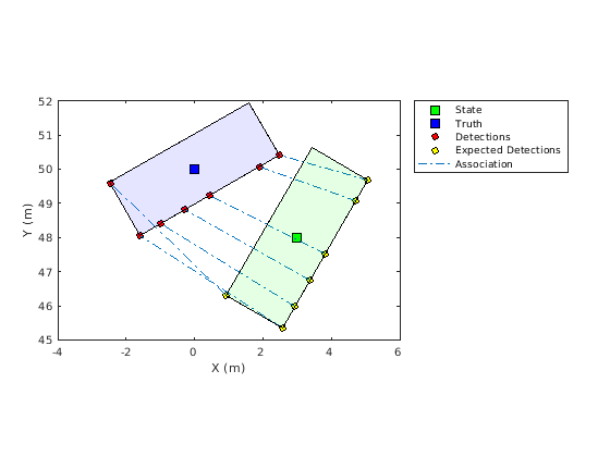 truthPos = [truthState(1:2);0]; truthDims = struct('Length',truthState(6),... 'Width',truthState(7),... 'Height', 0,... 'OriginOffset', [0 0 0]); truthOrient = quaternion([truthState(4) 0 0],'eulerd', 'ZYX','frame'); truthP.plotTrack(truthPos',truthDims,truthOrient); statePos = [tgtState(1:2);0]; stateDims = struct('Length',tgtState(6),... 'Width',tgtState(7),... 'Height',0,... 'OriginOffset', [0 0 0]); stateOrient = quaternion([tgtState(4) 0 0],'eulerd', 'ZYX','frame'); stateP.plotTrack(statePos', stateDims, stateOrient);
