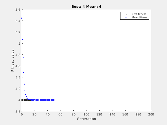 IntCon = 1; rng default % For reproducibility fun = @ps_example; A = []; b = []; Aeq = []; beq = []; lb = []; ub = []; nonlcon = []; options = optimoptions('ga','PlotFcn', @gaplotbestf); [x,fval,exitflag,output] = ga(fun,2,A,b,Aeq,beq,lb,ub,nonlcon,IntCon,options)