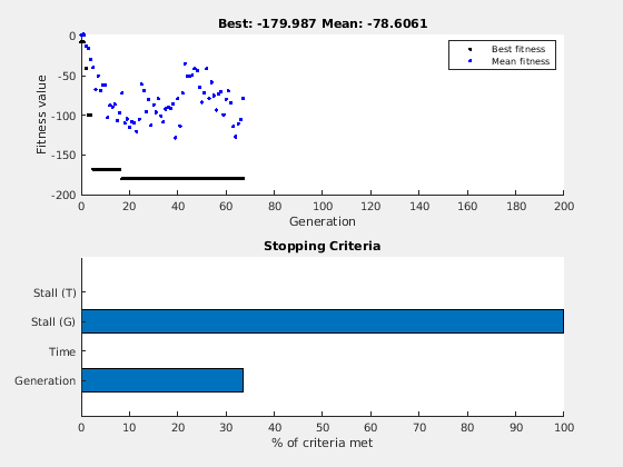 ga использование четыре различных критерия, чтобы определить, когда остановить решатель. ga остановки, когда максимальное количество поколений достигнуто; по умолчанию этот номер является 100 раз количеством переменных. ga также обнаруживает, если нет никакого изменения в лучшем значении фитнеса, в течение некоторого времени даваемом в секундах (остановите ограничение по времени), или для некоторого количества поколений (максимальные поколения останова). Другой критерии является максимальным ограничением по времени в секундах. Измените критерий остановки, чтобы увеличить максимальное число поколений к 300 и максимальных поколений останова к 100.