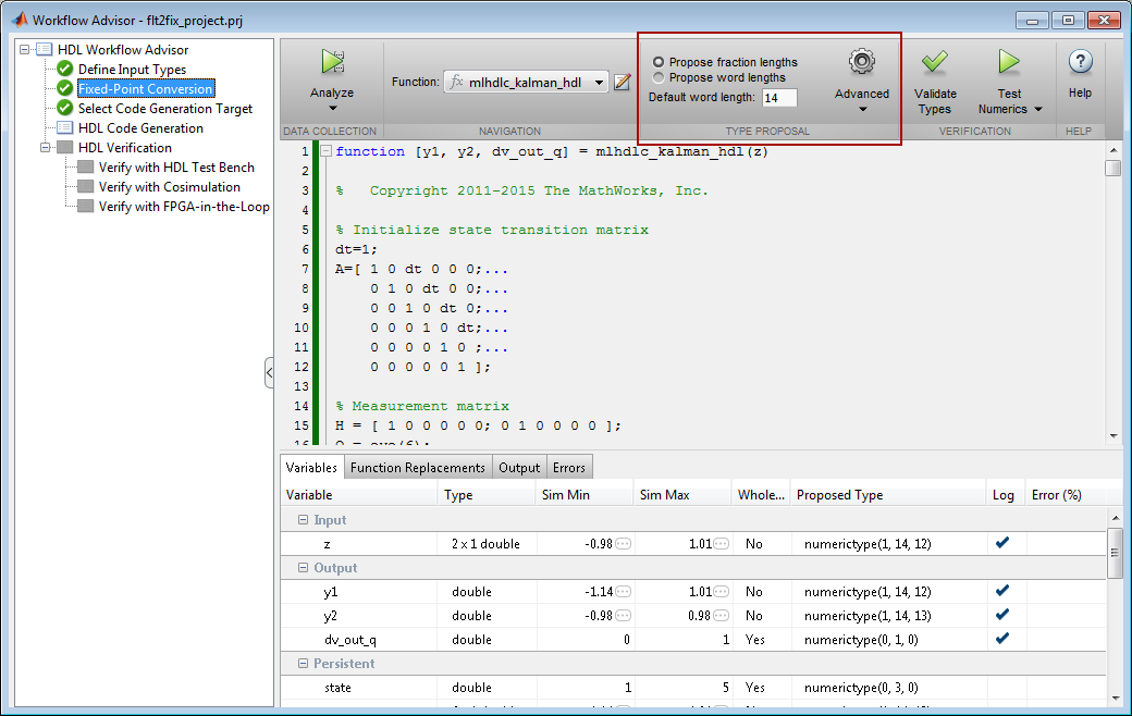 Этот пример использует Фильтр Калмана, подходящий для генерации HDL-кода, чтобы проиллюстрировать некоторые ключевые аспекты рабочего процесса преобразования фиксированной точки, в частности шаги 2 и 3 в вышеупомянутом списке.