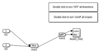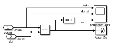 Для каждого выхода устройства под тестовой подсистемой следующая проверяющая утверждение модель сгенерирована, который проверяет, что исходный выход ('dut касательно') с cosimulation вывел ('cosim'), и генерирует сообщения утверждения, когда вход с блоком утверждения обнаруживает несоответствие.