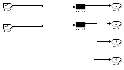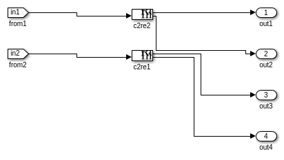 Стимул, который первоначально управляет DUT, питается полностью сконфигурированный HDL cosimulation блок с помощью блока 'From' как показано ниже. В некоторых случаях введите сигналы стимула, не может непосредственно питаться блок HDL Cosimulation; например, блок HDL Cosimulation не позволяет комплексные и векторные сигналы, и в таких случаях, далее массажируя входных сигналов стимула сделан автоматически. В текущей модели 'От' блоков непосредственно питают содержимое соответствующих блоков 'Goto'.