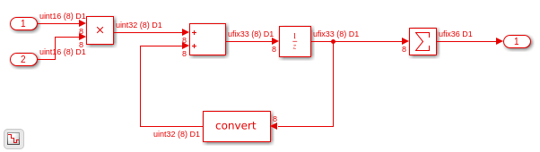 bdclose all; load_system('hdl_cosim_demo1') open_system('hdl_cosim_demo1/MAC') % Now generate vhdl code for the device under test 'MAC' in that % model in the source Simulink model. makehdl('hdl_cosim_demo1/MAC', 'targetlang', 'vh')