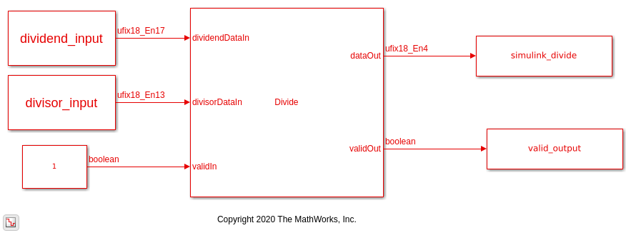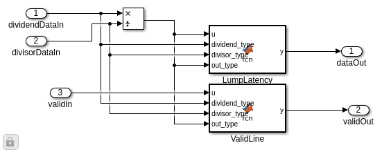 Когда вы открываете блок Divide, он использует блоки MATLAB function для данных и допустимых линий. Это как показано ниже.