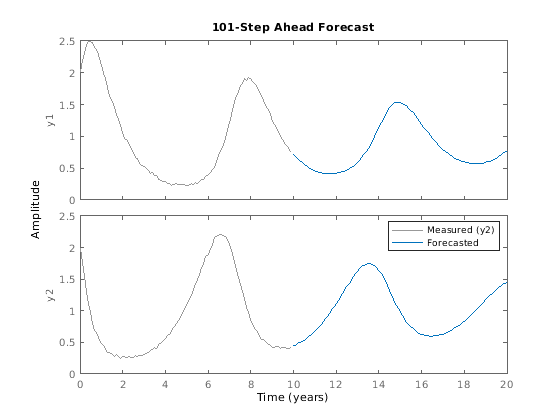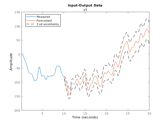 предсказывает выход идентифицированной модели yf = forecast(sys,PastData,K)sys временных рядовK шаги в будущее с помощью прошлых результатов измерений, PastData.