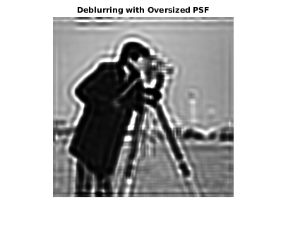 OVERPSF = padarray(UNDERPSF,[4 4],'replicate','both'); [J2,P2] = deconvblind(Blurred,OVERPSF); imshow(J2) title('Deblurring with Oversized PSF')