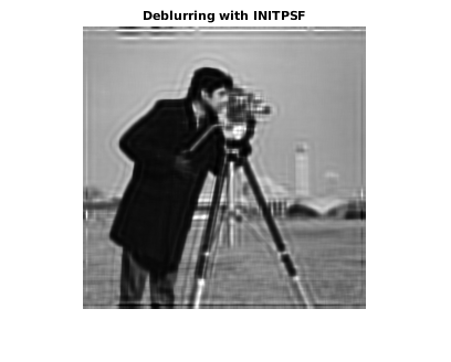 INITPSF = padarray(UNDERPSF,[2 2],'replicate','both'); [J3,P3] = deconvblind(Blurred,INITPSF); imshow(J3) title('Deblurring with INITPSF')