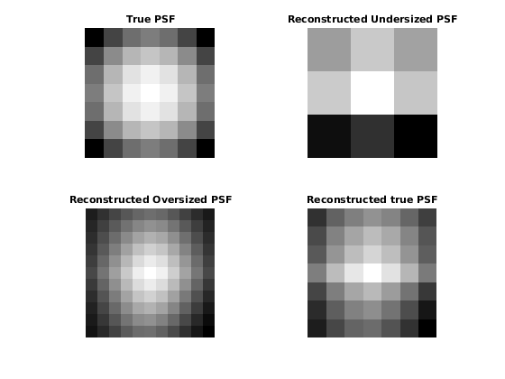 figure; subplot(2,2,1) imshow(PSF,[],'InitialMagnification','fit') title('True PSF') subplot(222) imshow(P1,[],'InitialMagnification','fit') title('Reconstructed Undersized PSF') subplot(2,2,3) imshow(P2,[],'InitialMagnification','fit') title('Reconstructed Oversized PSF') subplot(2,2,4) imshow(P3,[],'InitialMagnification','fit') title('Reconstructed true PSF')