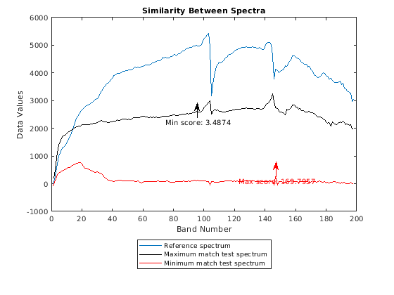 измеряет спектральное подобие между заданным тестовым спектром score = sid(testSpectrum,refSpectrum)testSpectrum и ссылочный спектр refSpectrum при помощи метода SID. Используйте этот синтаксис, чтобы сравнить спектральную подпись неизвестного материала против ссылочного спектра или вычислить спектральную изменчивость между двумя спектральными подписями.