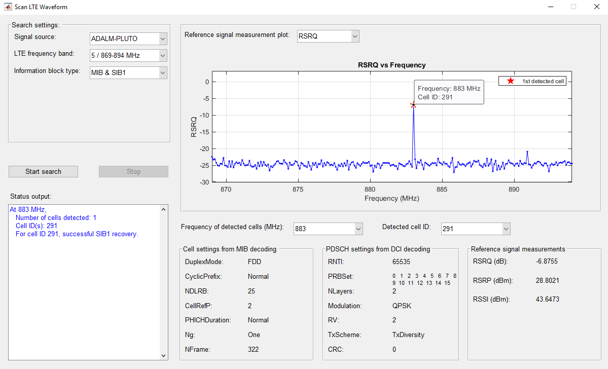 Как LTE Toolbox™ может использоваться, чтобы полностью синхронизировать, демодулировать и декодировать живой сигнал eNodeB. Прежде чем Оборудование пользователя (UE) может связаться с сетью, это должно выполнить поиск ячейки и процедуры отбора и получить начальную информацию о системе. Это включает паз получения и синхронизацию системы координат, обнаружение идентичность ячейки и декодирование Основного блока информации (MIB) и Системных Блоков информации (РОДСТВЕННИКИ). Этот пример демонстрирует этот процесс и декодирует MIB и SIB1, первый из Системных Блоков информации. Чтобы декодировать MIB и SIB1, всесторонний приемник требуется, способен к демодуляции и декодированию большинства нисходящих каналов и сигналов.