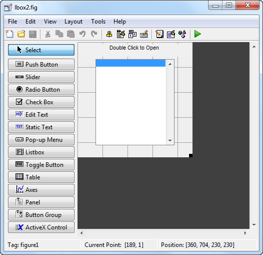 В этом примере показано, как исследовать и запустить предварительно созданное приложение GUIDE. Приложение содержит поле списка, которое отображает файлы в конкретной папке. Когда вы дважды кликаете элемент в списке, MATLAB открывает элемент.