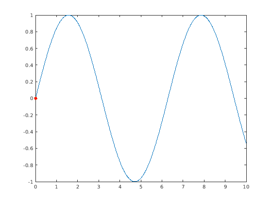 x = linspace(0,10,1000); y = sin(x); plot(x,y) hold on p = plot(x(1),y(1),'o','MarkerFaceColor','red'); hold off axis manual
