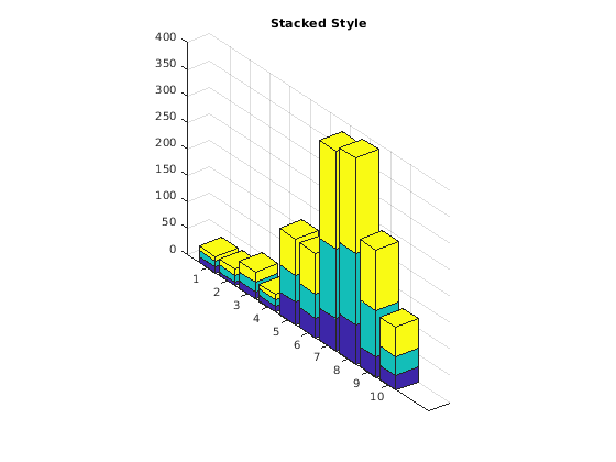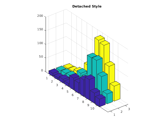 bar3(...,style) задает стиль панелей. style 'detached', 'grouped', или 'stacked'. Режимом по умолчанию отображения является 'detached'.