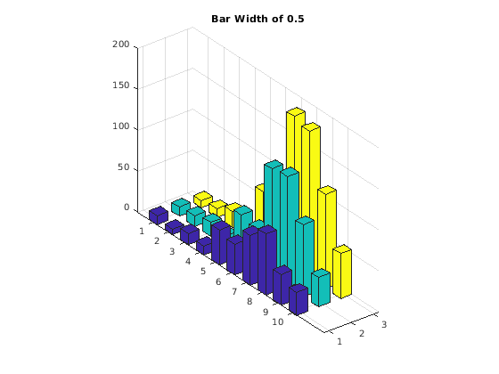 bar3(...,width) устанавливает ширину панелей и управляет разделением панелей в группе. width по умолчанию 0.8 и панели имеют небольшое разделение. Если width 1, панели в группе касаются друг друга.