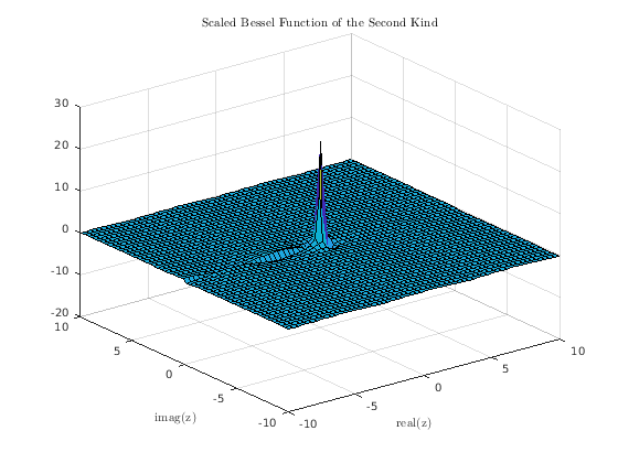 x = -10:0.35:10; y = x'; z = x + 1i*y; scale = 1; Y = bessely(2,z); Ys = bessely(2,z,scale);