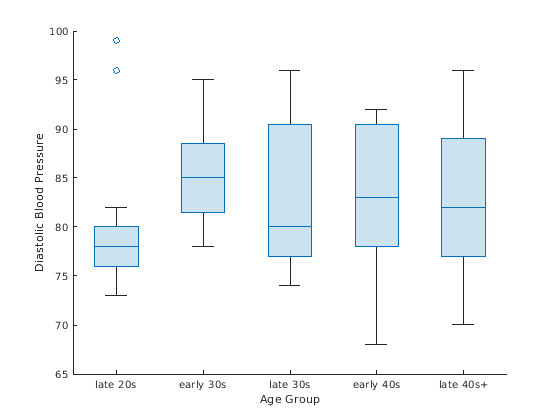 boxchart(groupAge,Diastolic) xlabel('Age Group') ylabel('Diastolic Blood Pressure')