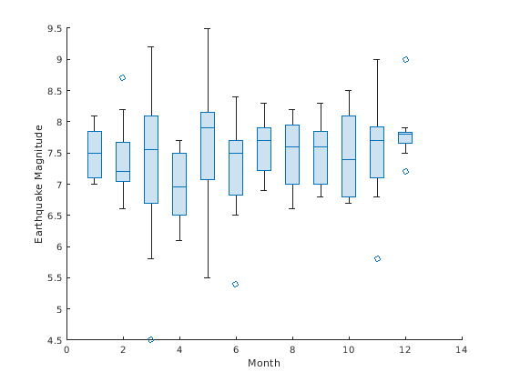 Постройте величины землетрясений согласно месяцу, в котором они произошли. Используйте вектор из величин землетрясения и сгруппированной переменной, указывающей на месяц каждого землетрясения. Для каждой группы данных создайте график поля и поместите ее в заданное положение вдоль оси X.