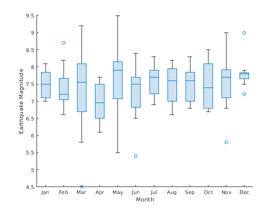 boxchart(earthquakes.Month,earthquakes.EarthquakeMagnitude) xlabel('Month') ylabel('Earthquake Magnitude')