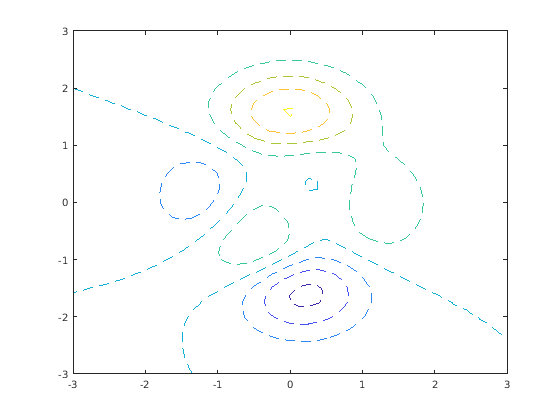 contour( создает контурный график, содержащий изолинии матричного Z)Z, где Z содержит значения высоты на x-y плоскость. MATLAB® автоматически выбирает линии контура, чтобы отобразиться. Столбец и индексы строки Z x и координаты y в плоскости, соответственно.
