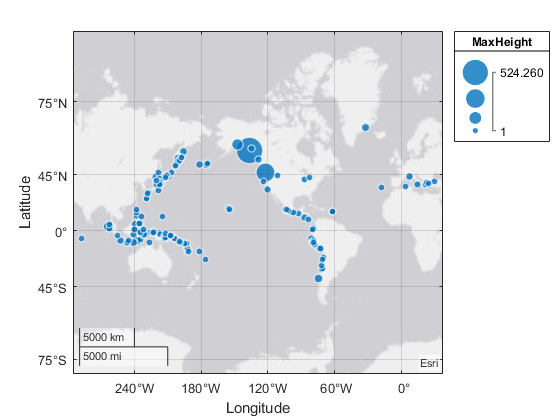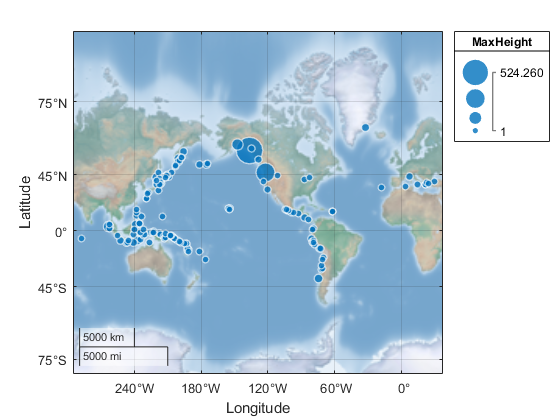 geobubble(tsunamis,'Latitude','Longitude','SizeVariable','MaxHeight')